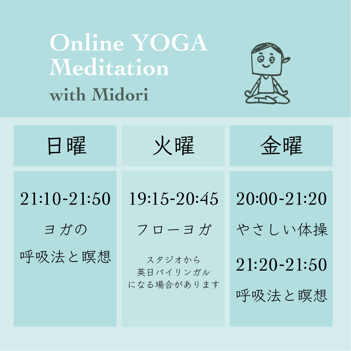 ・火曜日はヨガスタジオから配信。現地の状況により、英語と日本語のバイリンガルになる場合があります。